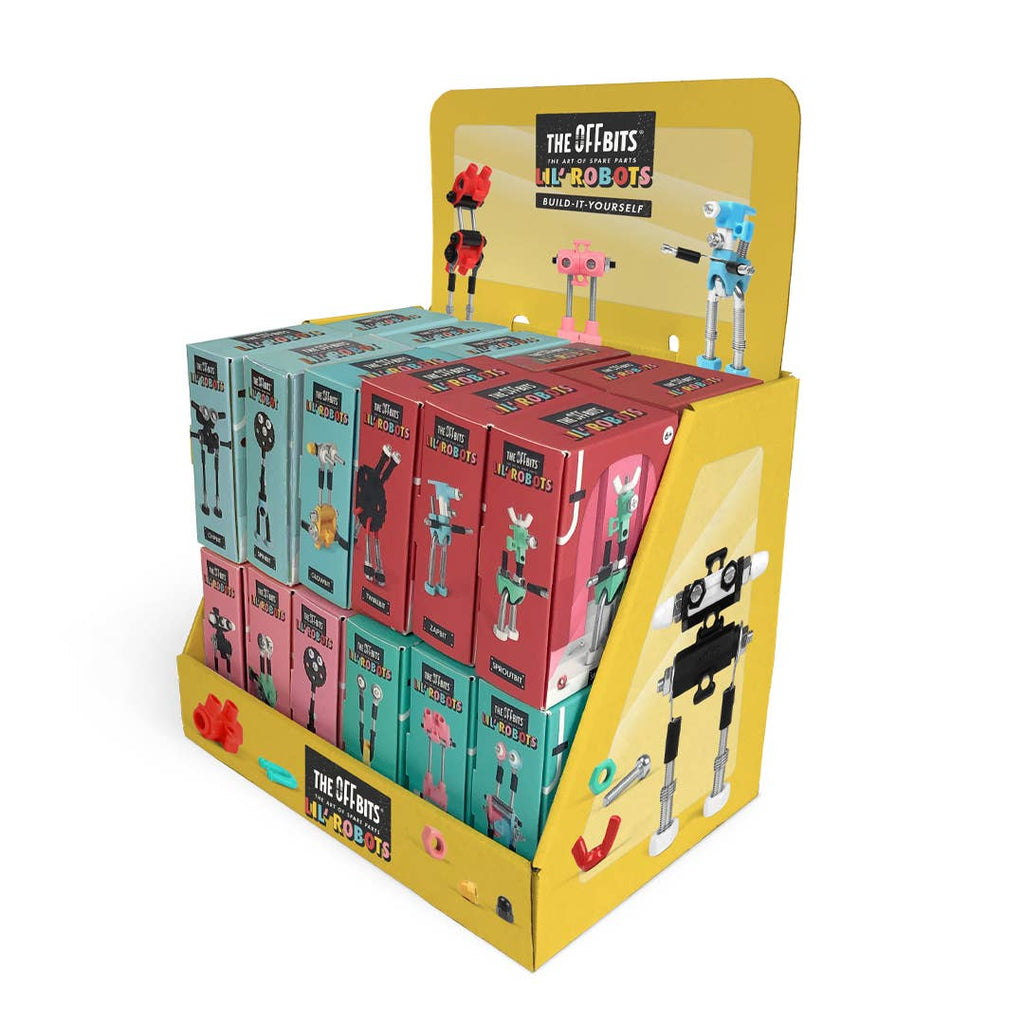Bring fun and creativity to your store with our 12 quirky Lil' Robots, each full of personality and made from a pile of spare parts! These giggly bots are ready to charm customers of all ages. Featuring a set of 24 Lil' Robots (two of each character), this unique collection is perfect for retail displays, designed to stand out and catch the eye in your shop.